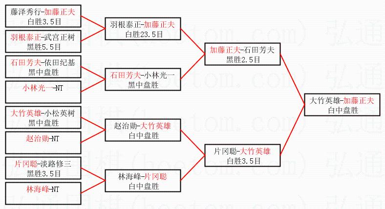 1.加藤正夫获得冠军,大竹英雄获得亚军。决赛比分:加藤正夫1:0大竹英雄。棋局: