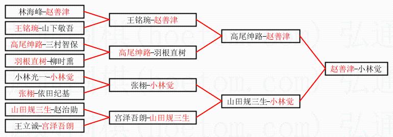 1.赵善津获得冠军,小林觉获得亚军。决赛比分:赵善津1:0小林觉。棋局:
