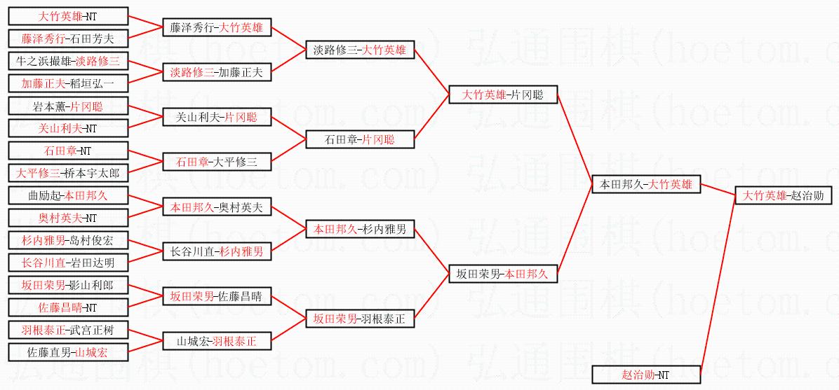 1.大竹英雄获得冠军,赵治勋获得亚军。决赛比分:大竹英雄3:1赵治勋。棋局: