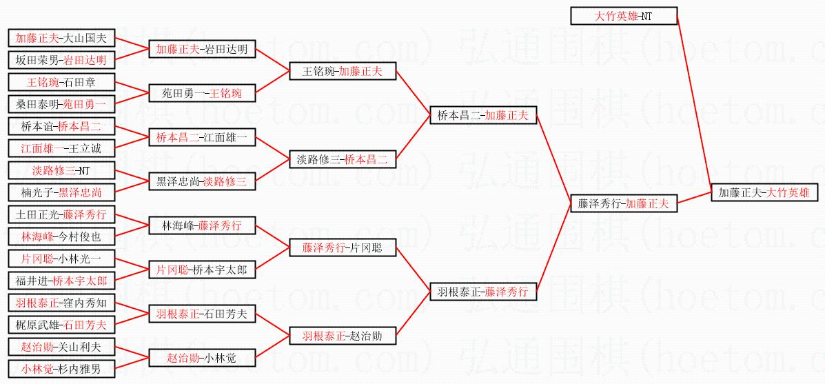 1.大竹英雄获得冠军,加藤正夫获得亚军。决赛比分:大竹英雄3:1加藤正夫。棋局: