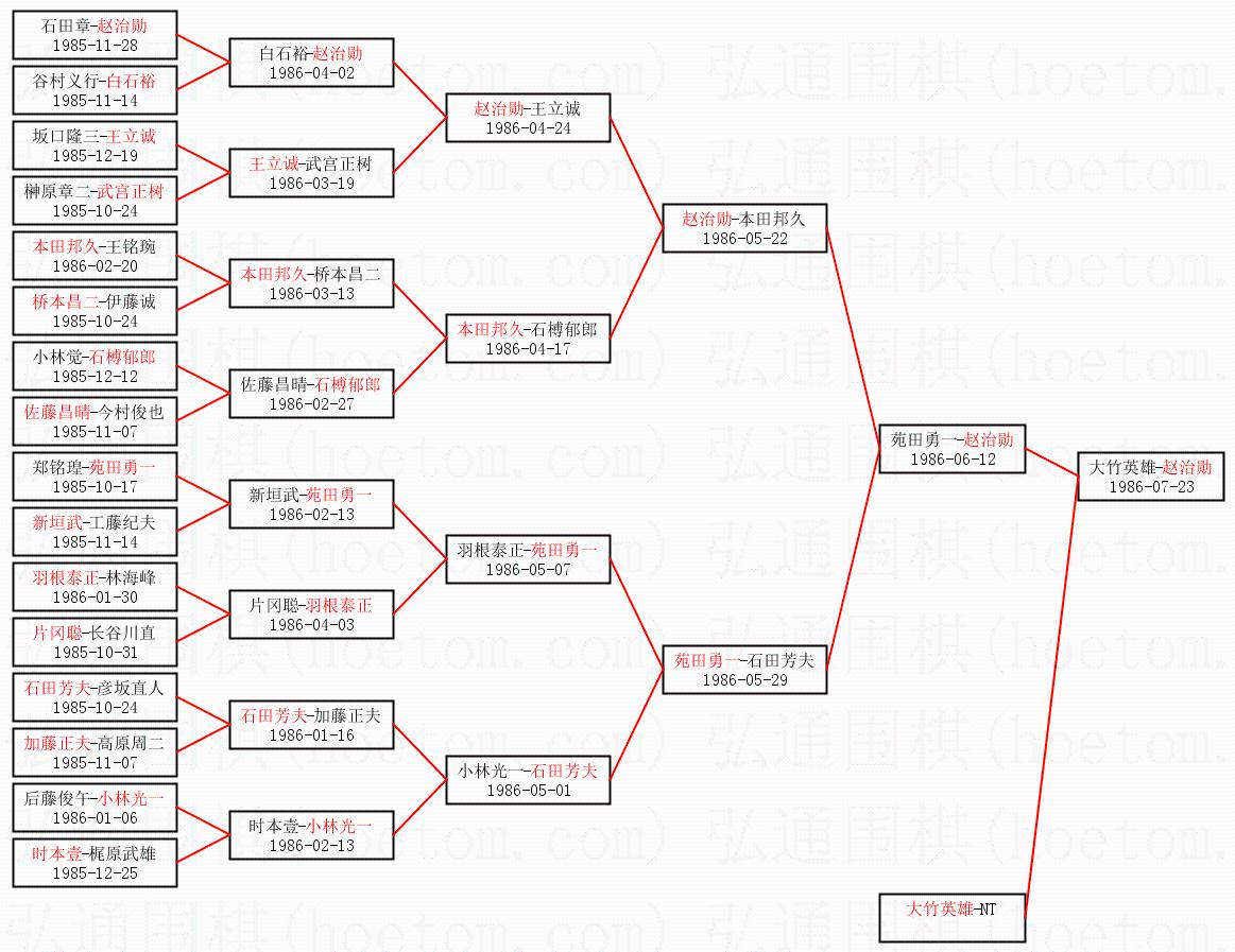 1.赵治勋获得冠军,大竹英雄获得亚军。决赛比分:赵治勋3:0大竹英雄。棋局: