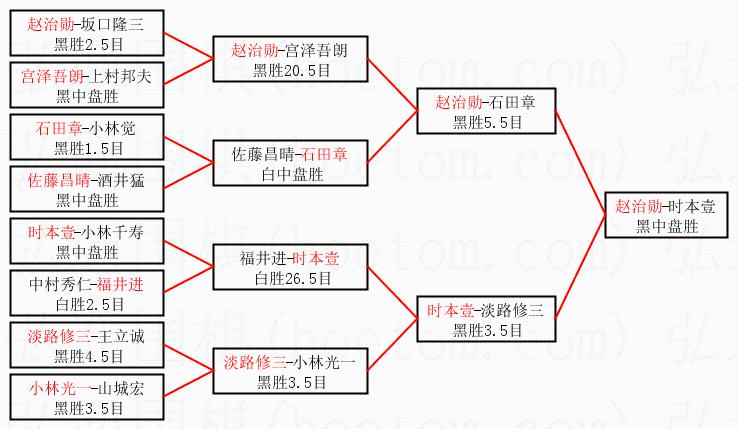 1.赵治勋获得冠军,时本壹获得亚军。决赛比分:赵治勋1:0时本壹。棋局: