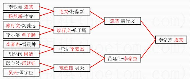 1.连笑获得冠军,李豪杰获得亚军。决赛比分:连笑1:0李豪杰。棋局: