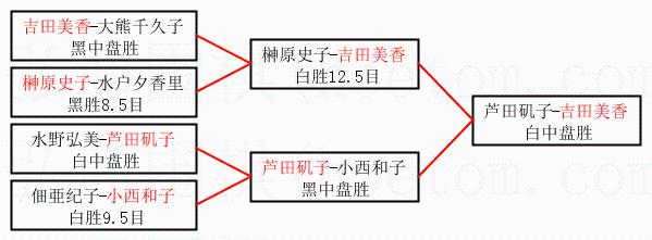 1.吉田美香获得冠军,芦田矶子获得亚军。决赛比分:吉田美香1:0芦田矶子。棋局:
