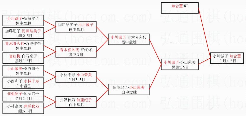 1.知念薰获得冠军,小川诚子获得亚军。决赛比分:知念薰2:1小川诚子。棋局: