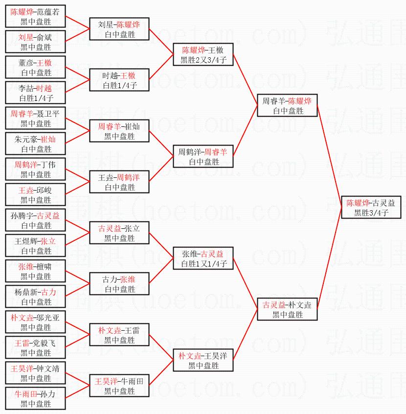 1.陈耀烨获得冠军,古灵益获得亚军。决赛比分:陈耀烨1:0古灵益。棋局: