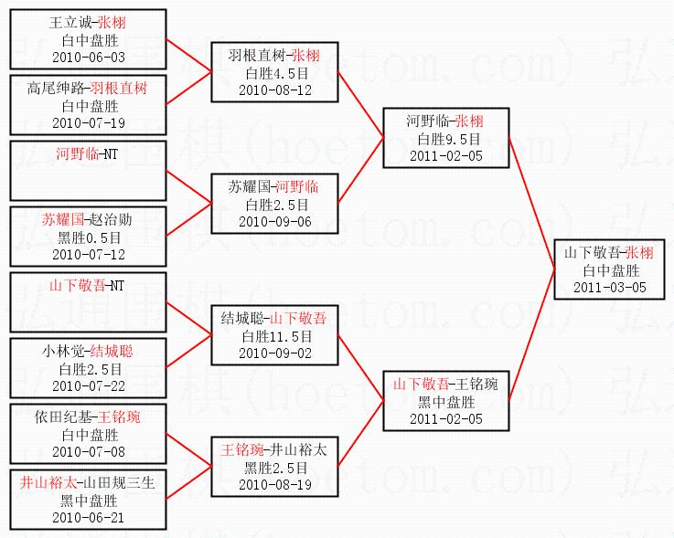 1.张栩获得冠军,山下敬吾获得亚军。决赛比分:张栩1:0山下敬吾。棋局: