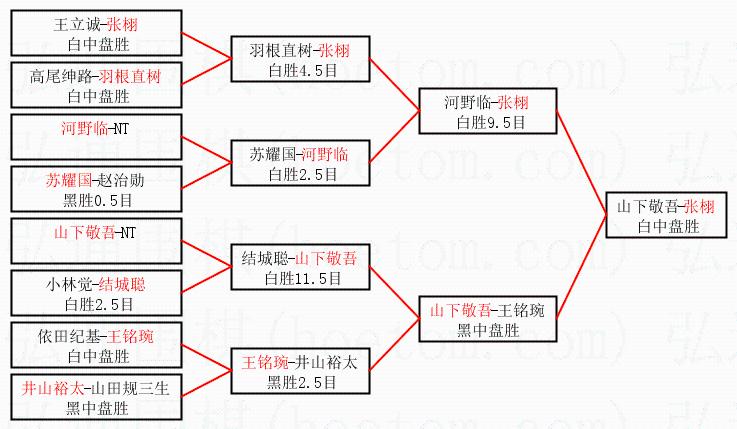 1.张栩获得冠军,山下敬吾获得亚军。决赛比分:张栩1:0山下敬吾。棋局: