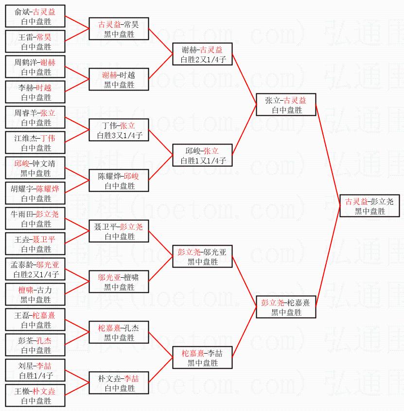 1.古灵益获得冠军,彭立尧获得亚军。决赛比分:古灵益1:0彭立尧。棋局: