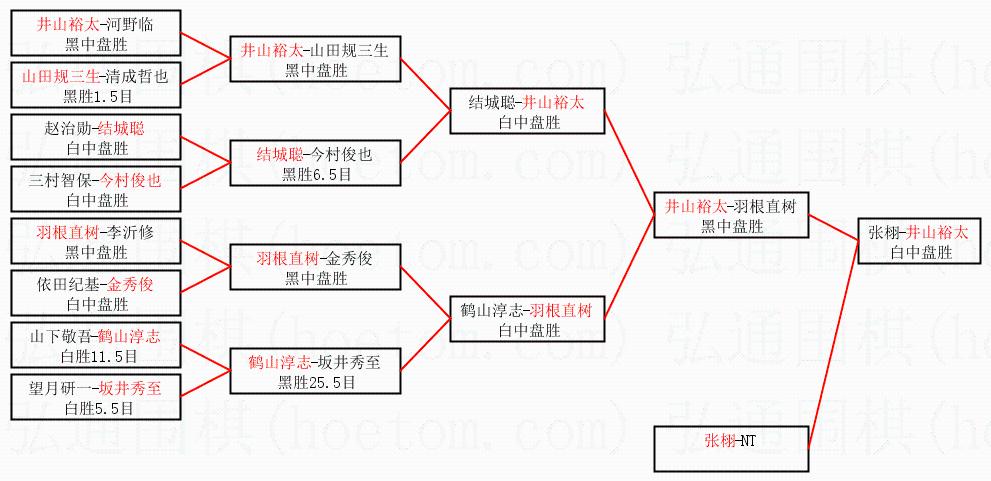 1.井山裕太获得冠军,张栩获得亚军。决赛比分:井山裕太3:0张栩。棋局:
