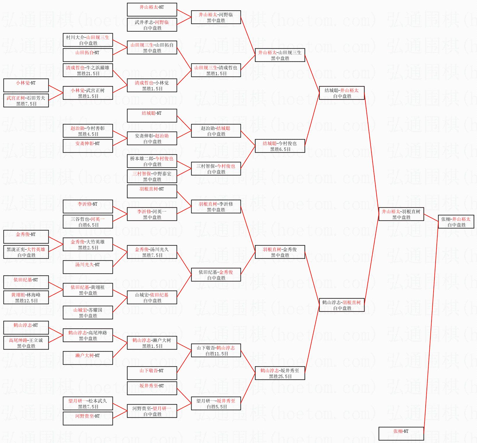 2.上半区半决赛井山裕太获胜, 比分:井山裕太 1:0 羽根直树。棋局: