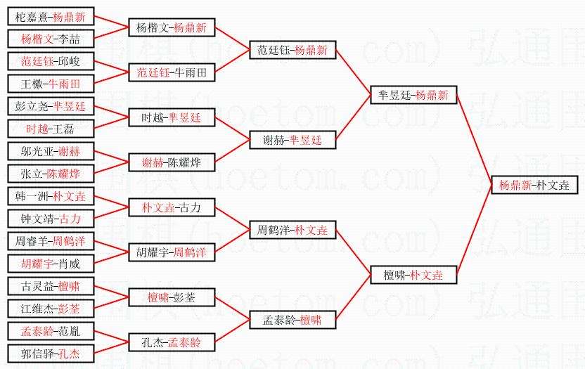 1.杨鼎新获得冠军,朴文垚获得亚军。决赛比分:杨鼎新1:0朴文垚。棋局: