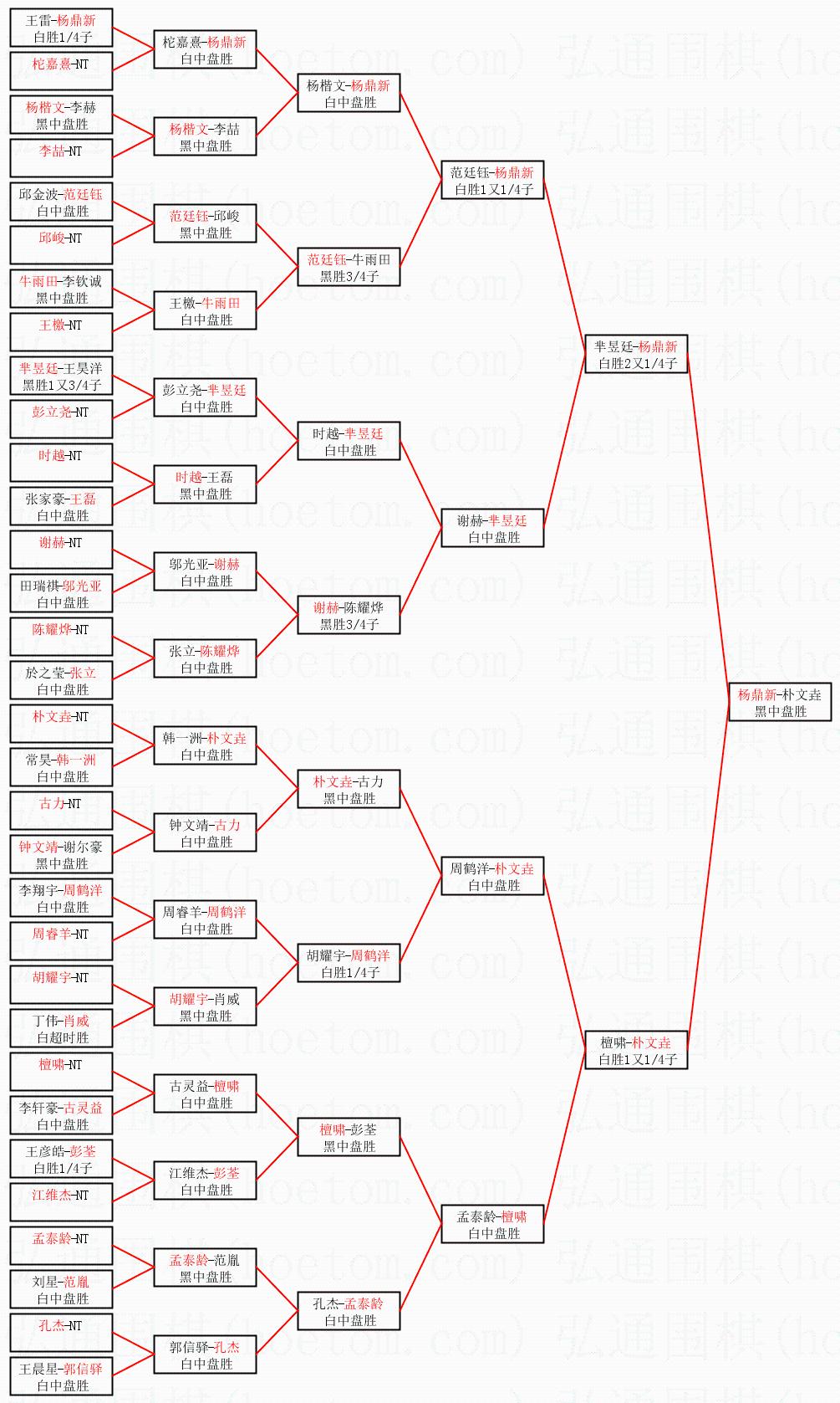 1.杨鼎新获得冠军,朴文垚获得亚军。决赛比分:杨鼎新1:0朴文垚。棋局: