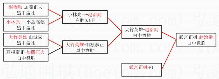 2.上半区半决赛赵治勋获胜, 比分:赵治勋 1:0 大竹英雄。棋局: