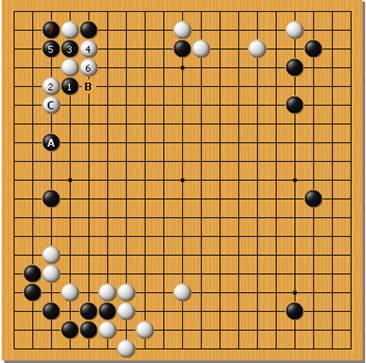 上方侵分告一段落后双方回到全盘最后一处未被定式占据的角落——右下。白棋54位的逼住时越局后检讨应高一路飞。实战的选择是处于尽快找回实地平衡的考虑,然而被黑棋55尖分断后白棋不得不走出58—63的交换帮黑棋成空,至64看似白棋两边都走到事实上也帮助黑棋走好了两边。然而黑棋随即亦犯下贪实地轻大局的错误。65如果在下图的A位跳,补强左边拆二,以下白大致在B位联络,黑C位抢一个大官子,则局面一切尚早。