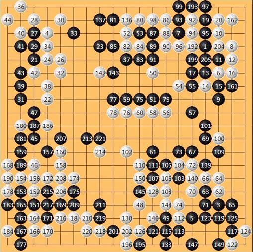 本局双方展开了数次捞洗打劫转换的精彩战役,右上、左下双方各吃掉对手一块棋。弈至221手,形势仍然比较复杂,胜负结果有赖于官子战双方的发挥。当黑221压时,白棋的本手,或者说只此一手是在214右一位补棋。可是——