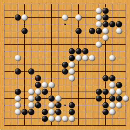按照时间排序,执黑弈出对角布局的棋手共有15人次(下图为例子之一)