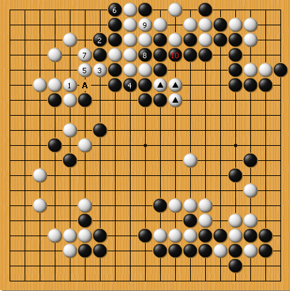 如果白棋这么老实粘住就中计了,如图进行将是黑棋“劫爆”白棋。如果白1在A位当,黑棋就简单挖打再粘上亦可满意,外围白△三子半死不活,黑棋明显好下。