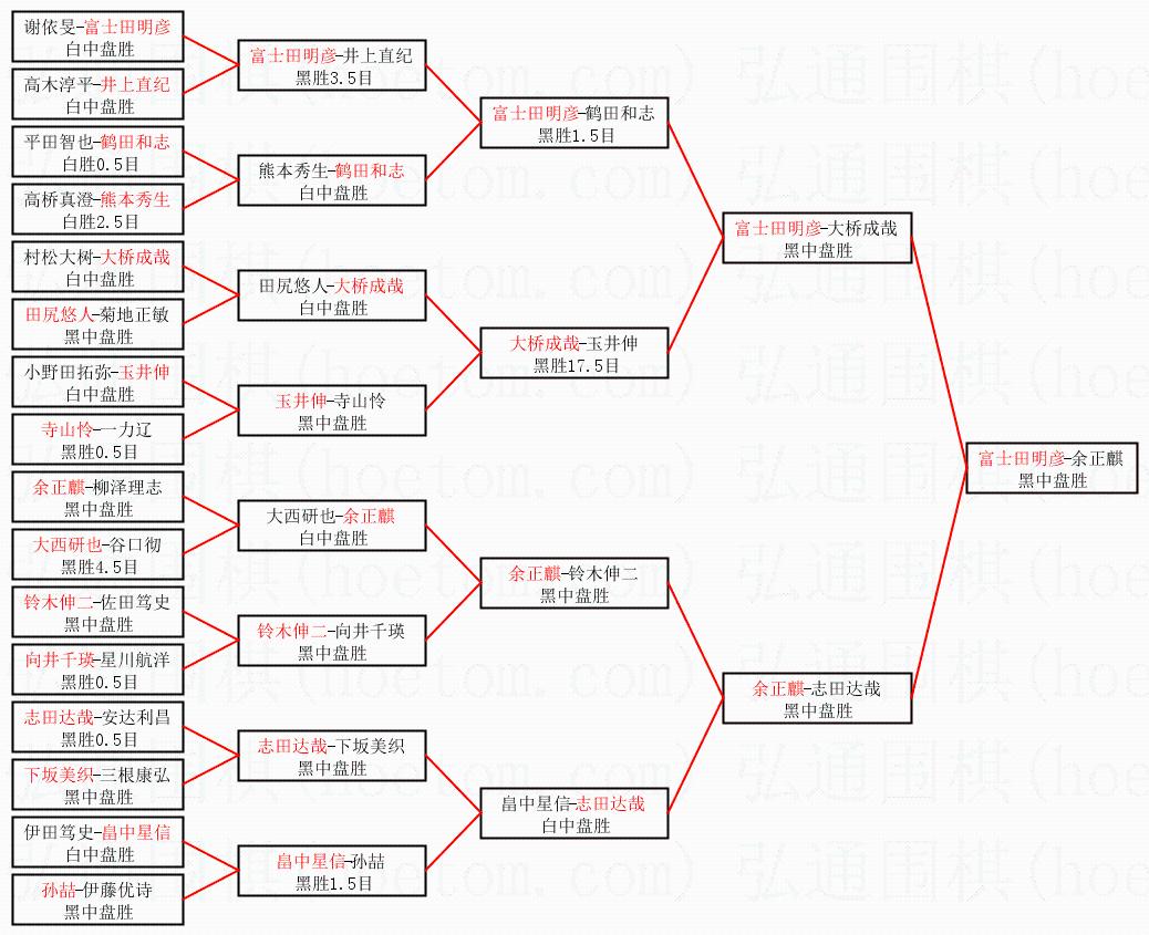 1.富士田明彦获得冠军,余正麒获得亚军。决赛比分:富士田明彦2:0余正麒。棋局: