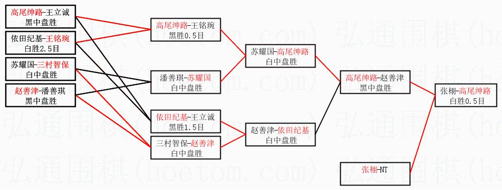1.高尾绅路获得冠军,张栩获得亚军。决赛比分:高尾绅路4:1张栩。棋局: