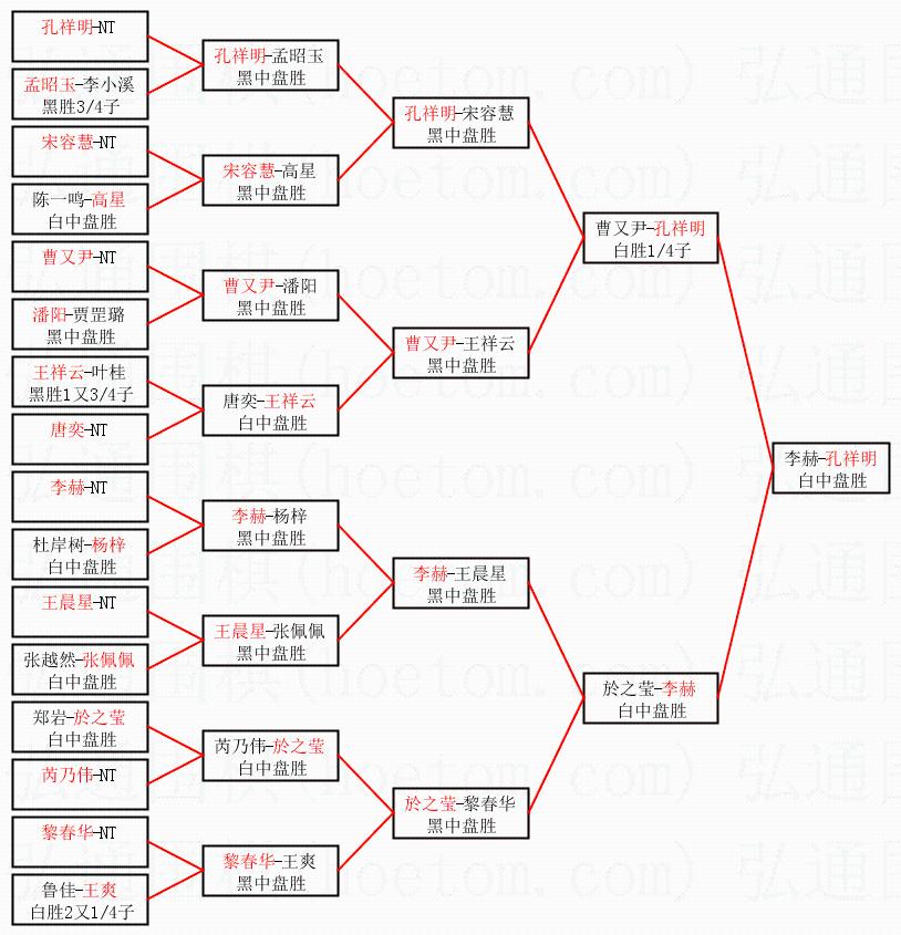 1.孔祥明获得冠军,李赫获得亚军。决赛比分:孔祥明1:0李赫。棋局: