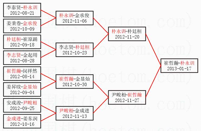 1.朴永训获得冠军,崔哲瀚获得亚军。决赛比分:朴永训2:1崔哲瀚。棋局: