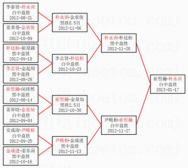 1.朴永训获得冠军,崔哲瀚获得亚军。决赛比分:朴永训2:1崔哲瀚。棋局:
