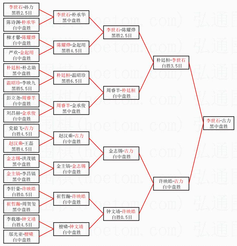 1.李世石获得冠军,古力获得亚军。决赛比分:李世石3:2古力。棋局: