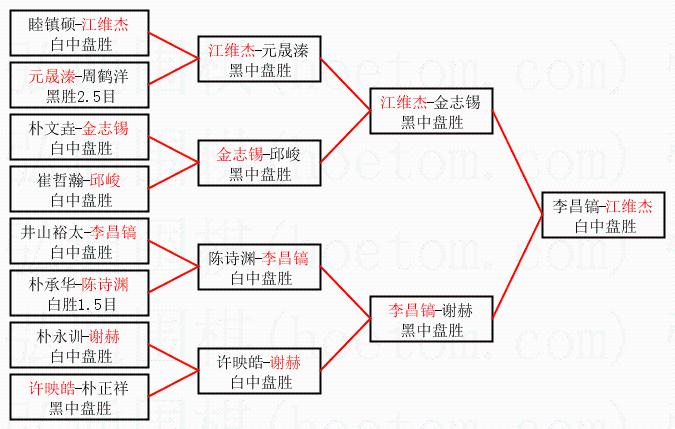 1.江维杰获得冠军,李昌镐获得亚军。决赛比分:江维杰2:0李昌镐。棋局: