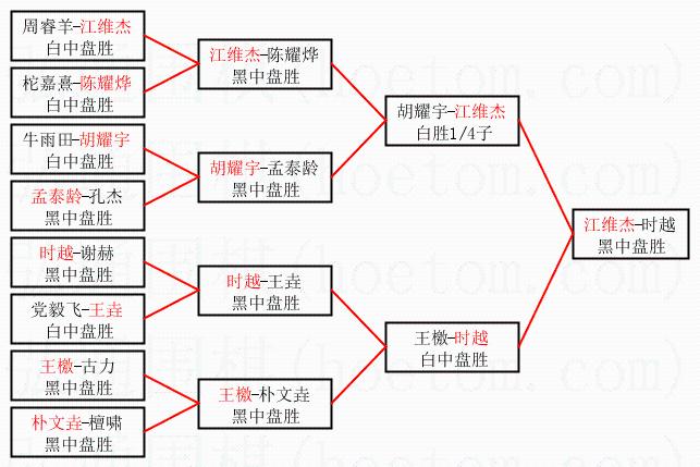 1.江维杰获得冠军,时越获得亚军。决赛比分:江维杰1:0时越。棋局: