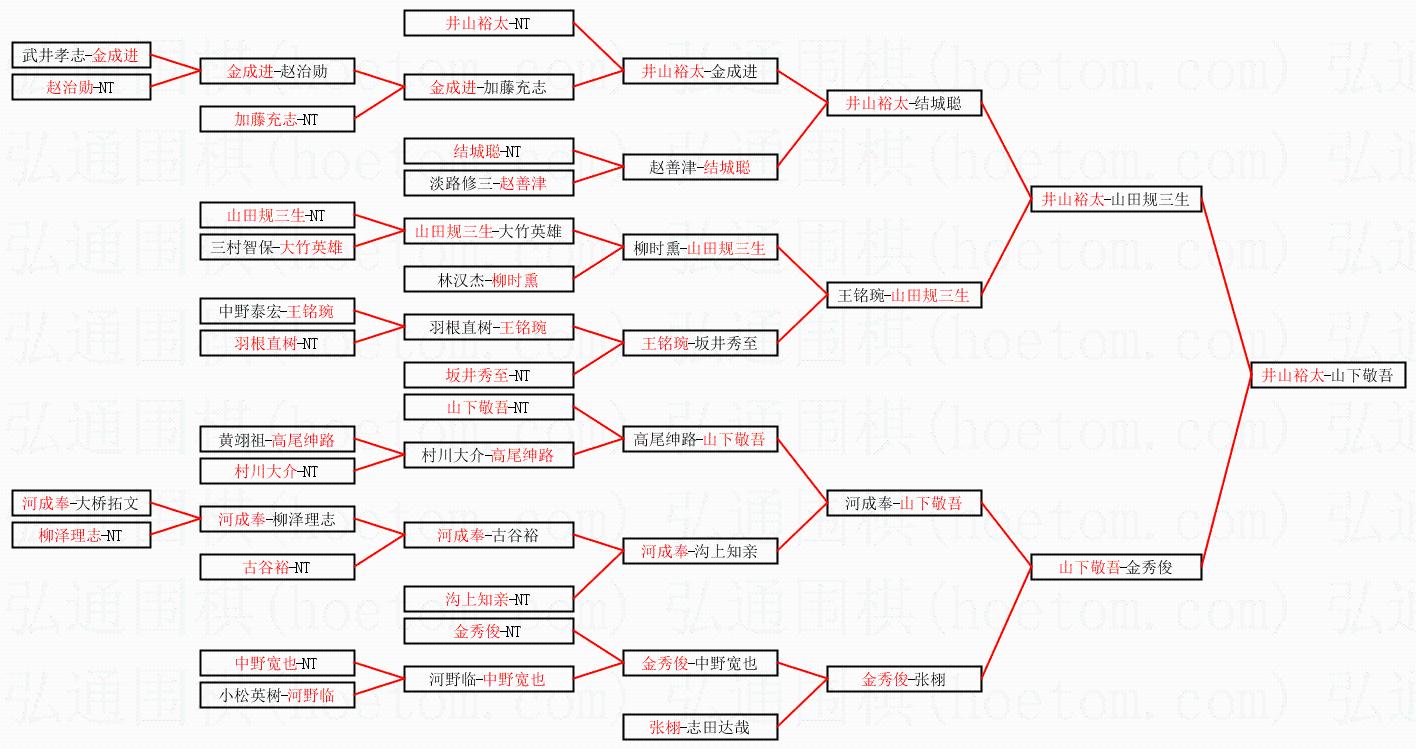 1.井山裕太获得冠军,山下敬吾获得亚军。决赛比分:井山裕太1:0山下敬吾。棋局: