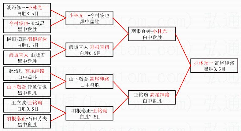 1.小林光一获得冠军,高尾绅路获得亚军。决赛比分:小林光一1:0高尾绅路。棋局: