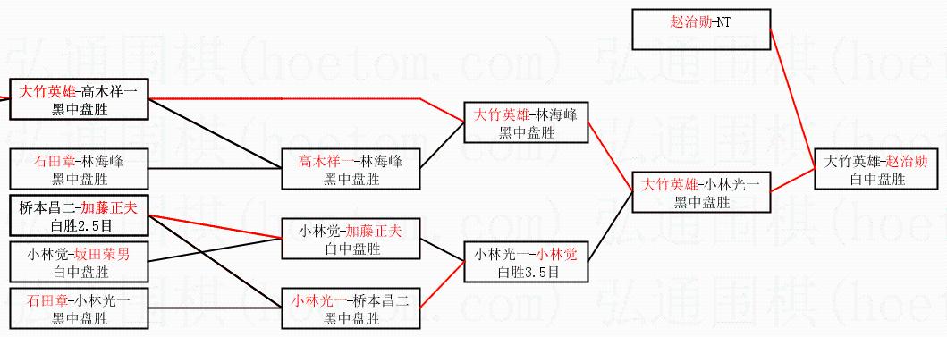 1.赵治勋获得冠军,大竹英雄获得亚军。决赛比分:赵治勋4:3大竹英雄。棋局: