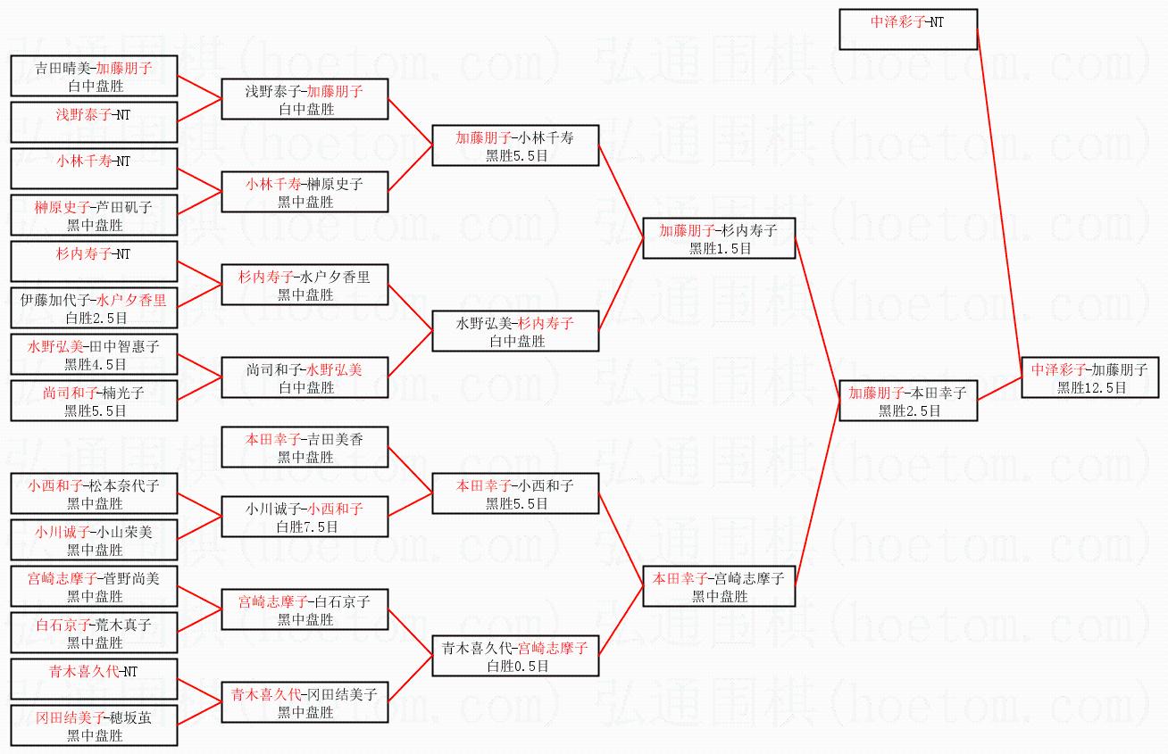 1.中泽彩子获得冠军,加藤朋子获得亚军。决赛比分:中泽彩子1:1加藤朋子。棋局: