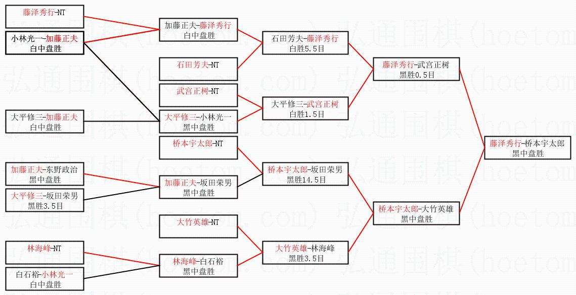 1.藤泽秀行获得冠军,桥本宇太郎获得亚军。决赛比分:藤泽秀行4:1桥本宇太郎。棋局: