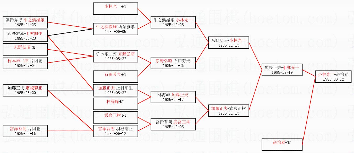 1.小林光一获得冠军,赵治勋获得亚军。决赛比分:小林光一4:2赵治勋。棋局: