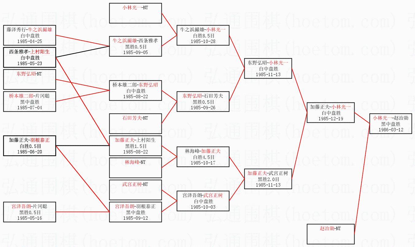 1.小林光一获得冠军,赵治勋获得亚军。决赛比分:小林光一4:2赵治勋。棋局: