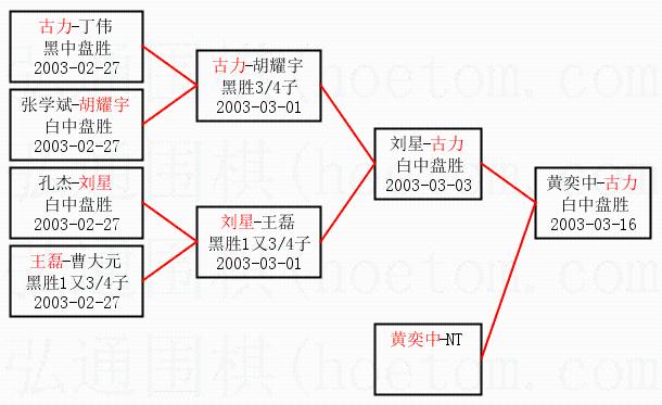 1.古力获得冠军,黄奕中获得亚军。决赛比分:古力2:1黄奕中。棋局: