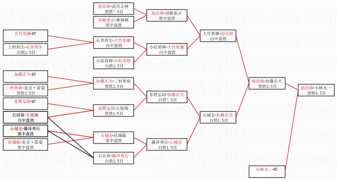 | 1.赵治勋获得冠军,小林光一获得亚军。决赛比分:赵治勋4:2小林光一。棋局: | ||