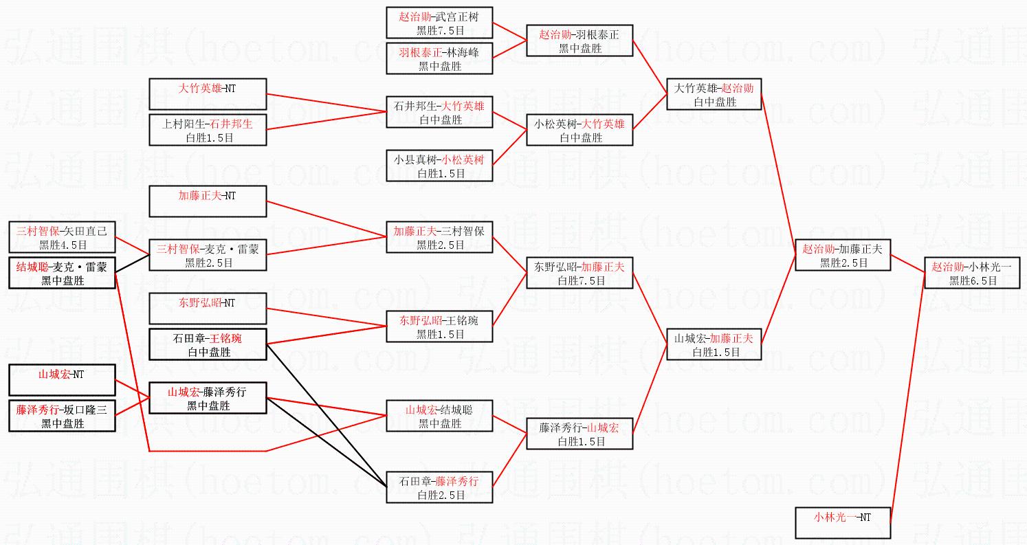 1.赵治勋获得冠军,小林光一获得亚军。决赛比分:赵治勋4:2小林光一。棋局: