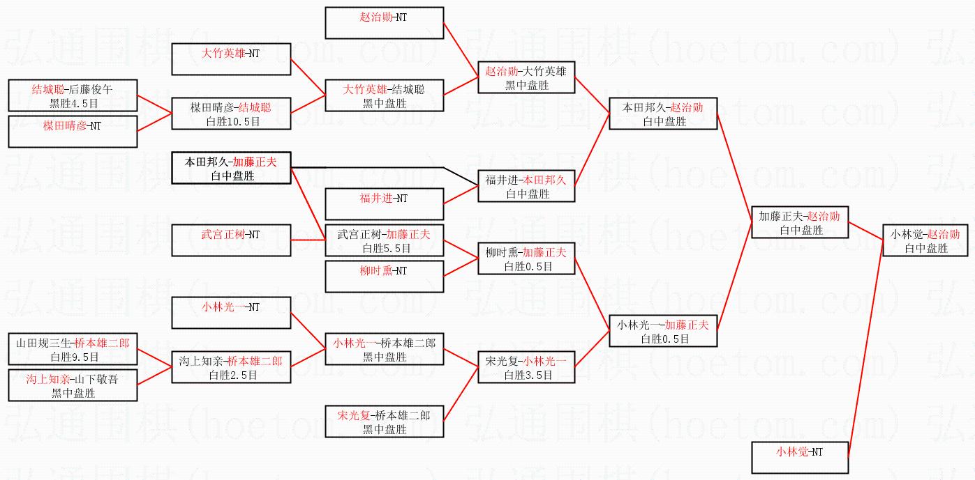 | 1.赵治勋获得冠军,小林觉获得亚军。决赛比分:赵治勋4:3小林觉。棋局: | ||