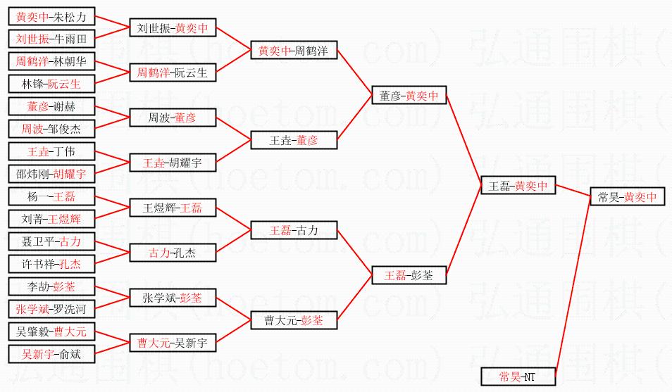 1.黄奕中获得冠军,常昊获得亚军。决赛比分:黄奕中2:0常昊。棋局: