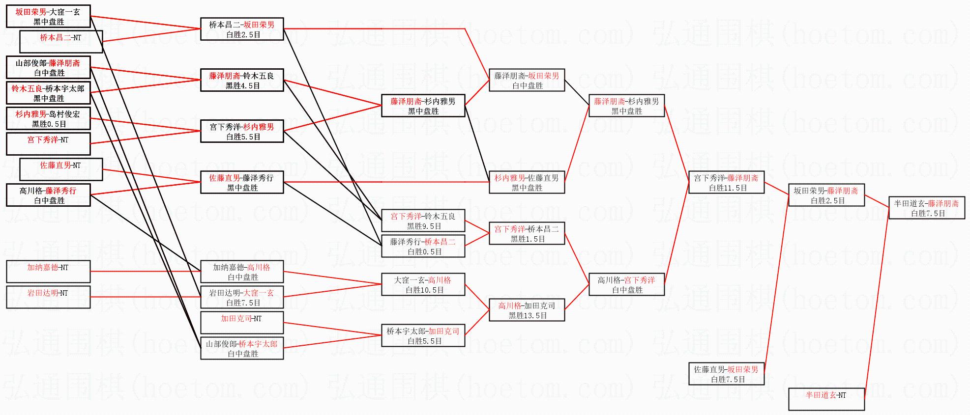 | 2.上半区半决赛藤泽朋斋获胜, 比分:藤泽朋斋 1:0 坂田荣男。棋局: | ||