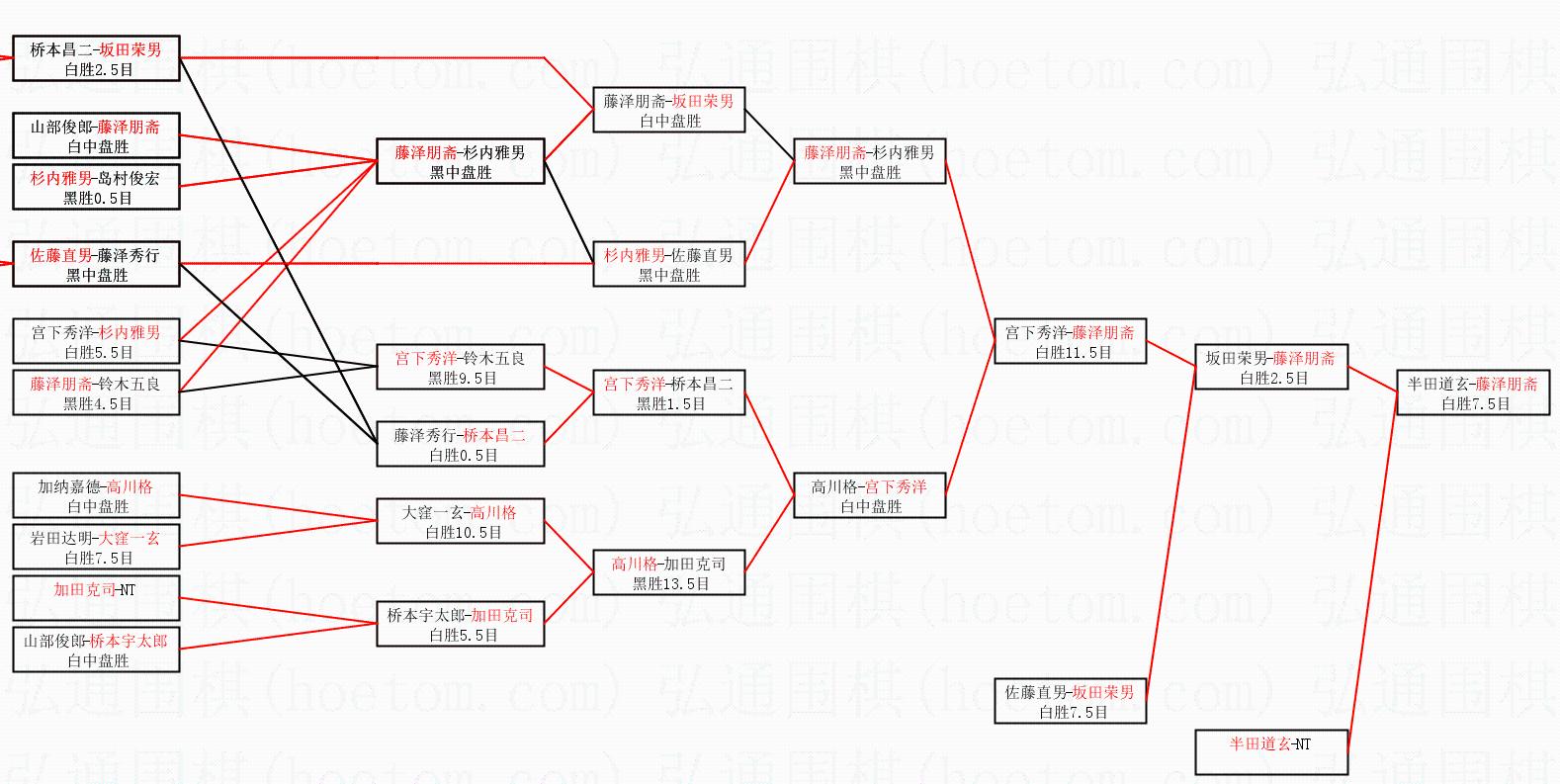 | 2.上半区半决赛藤泽朋斋获胜, 比分:藤泽朋斋 1:0 坂田荣男。棋局: | ||
