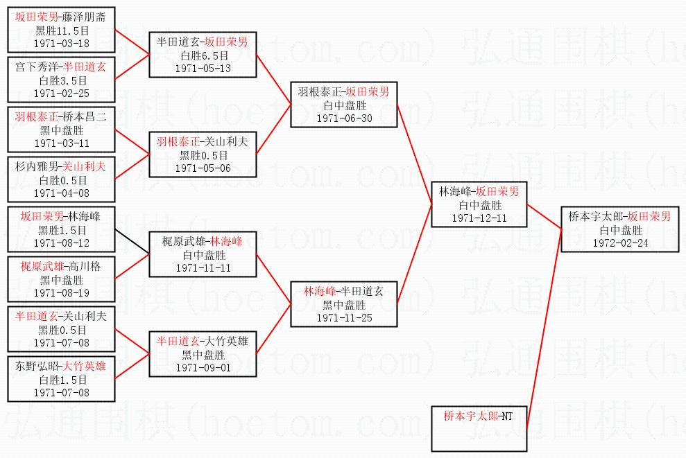 | 1.坂田荣男获得冠军,桥本宇太郎获得亚军。决赛比分:坂田荣男3:2桥本宇太郎。棋局: | ||