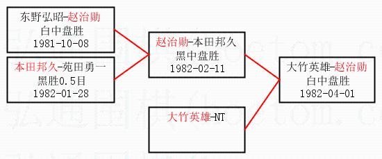 2.上半区半决赛赵治勋获胜, 比分:赵治勋 1:0 本田邦久。棋局: