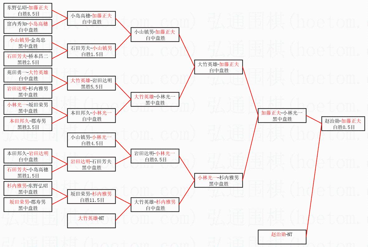 1.加藤正夫获得冠军,赵治勋获得亚军。决赛比分:加藤正夫3:2赵治勋。棋局: