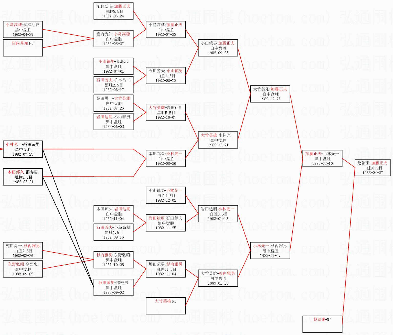 1.加藤正夫获得冠军,赵治勋获得亚军。决赛比分:加藤正夫3:2赵治勋。棋局: