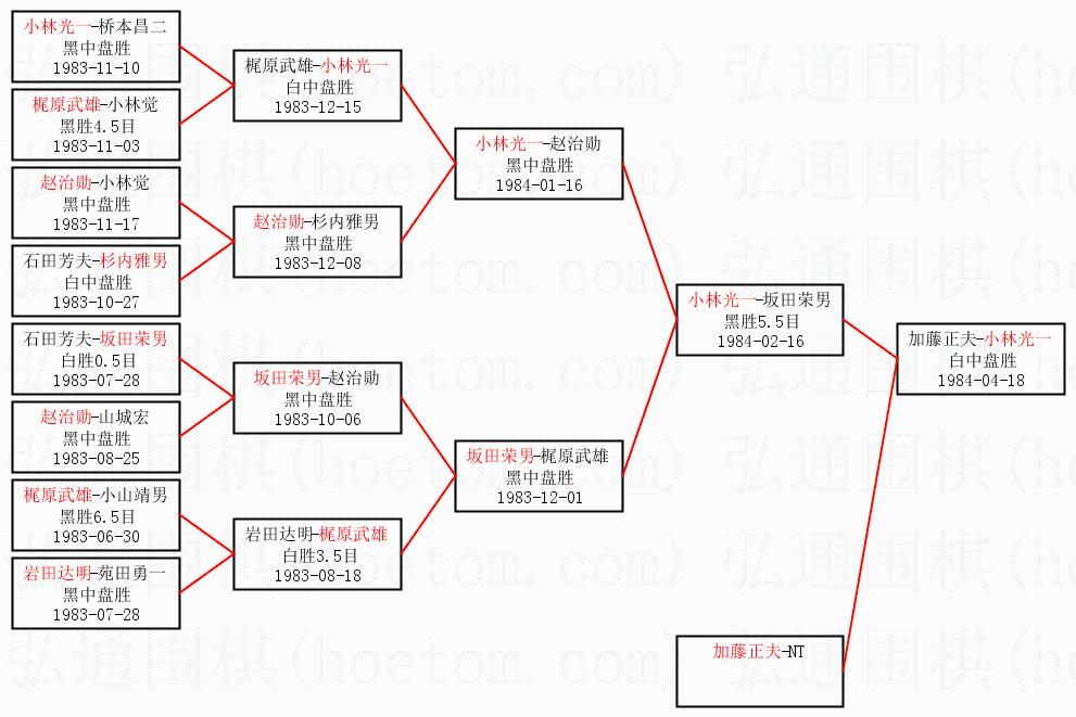 1.小林光一获得冠军,加藤正夫获得亚军。决赛比分:小林光一3:2加藤正夫。棋局: