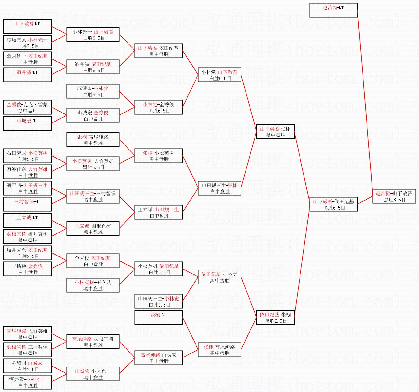 1.赵治勋获得冠军,山下敬吾获得亚军。决赛比分:赵治勋3:2山下敬吾。棋局:
